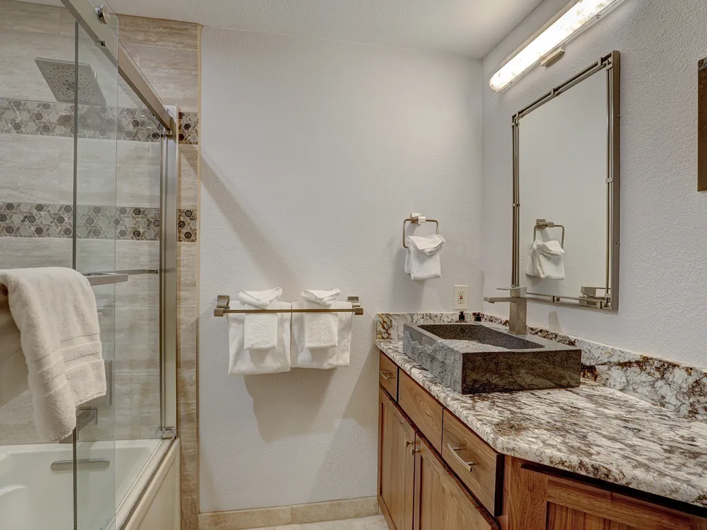This premier four-bedroom condominium, located in the River Mountain Lodge, welcomes you to a spacious 1300 square foot home with a living room, dining room, and fully-equipped kitchen. The property is impeccably designed with the latest furnishing, décor and appliances including granite countertops, stainless steel appliances, and four full custom bathrooms. Enjoy restful nights that sleeps up to 12 comfortably, with three king bedrooms, and a room with two twins over double bunk beds (perfect for kids), plus a 55’ TV in each bedroom. The property also features private balconies with views of the mountains, a gas fireplace, free WIFI, and more that will provide a relaxing place to return to after a day on the mountain.