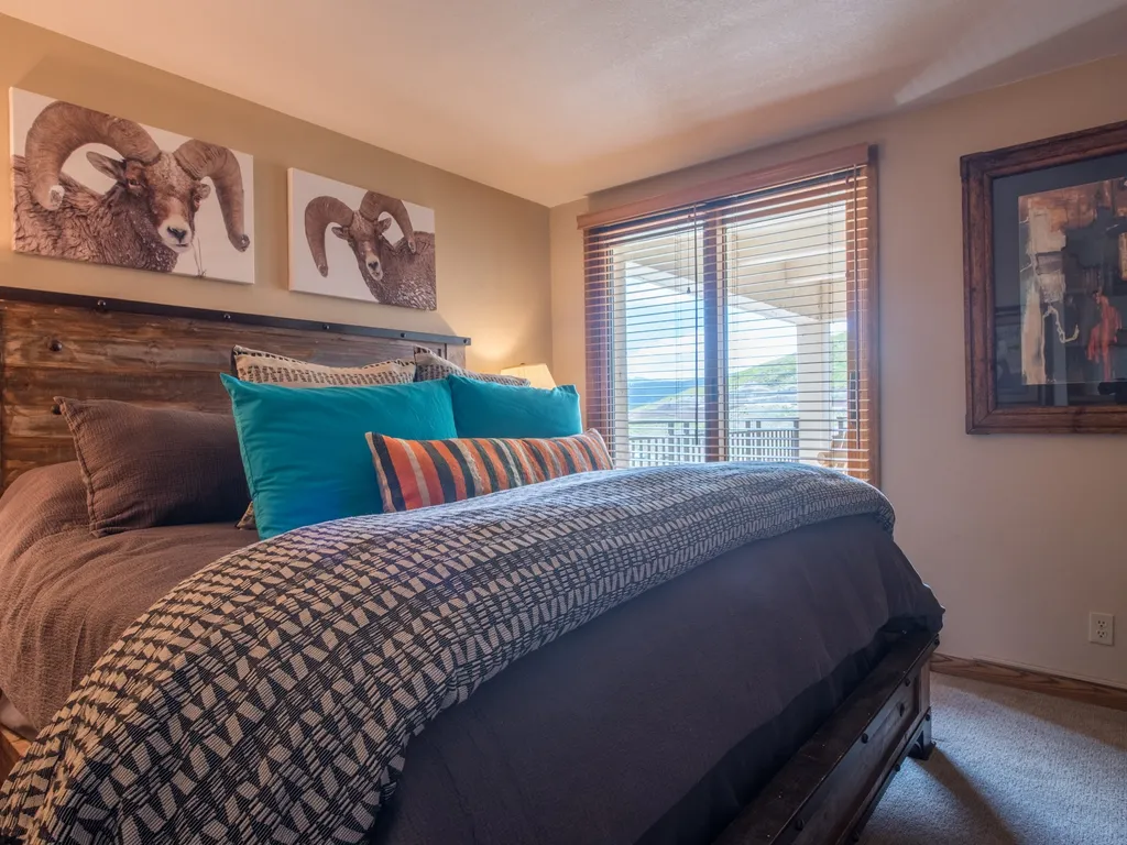 Elegant stone tile paves the entry hall of this 2BR/2BA 4th floor residence, and unique artwork lines the walls. The kitchen showcases granite countertops and tile backsplash, while the open floor plan of the dining/living area is home to a comfortable mix of rustic and modern furnishings. Step out on your private balcony and take in the spectacular beauty of Red Mountain at sunset, or view it from the comfort of your living room while sitting by the wood burning fireplace. Flat panel TVs are found in all of the rooms, included a 55” TV in the master for watching multiple movies at once. Full laundry facilities in unit. Sleeps 7 comfortably with a King in the master bedroom, a twin and set of bunk beds in the guest room, and a Queen sleeper sofa in the living room. Outdoor entry access.