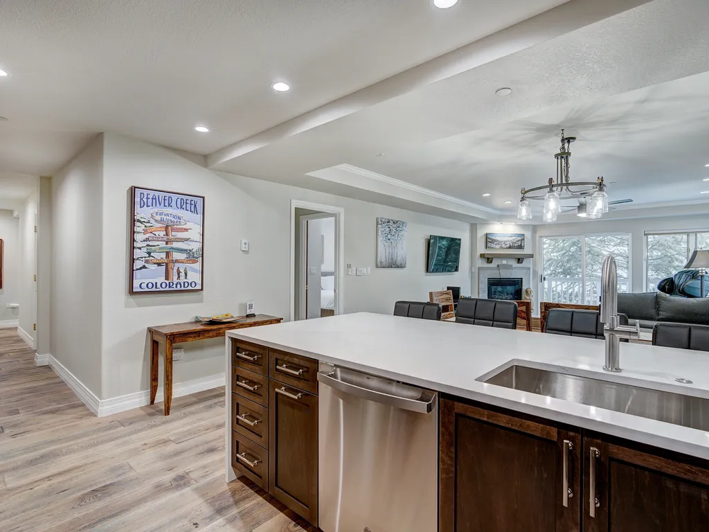 A newly renovated gourmet kitchen with stainless steel appliances will inspire family and friends to create delicious meals, while the stylish four-person breakfast bar is ideal for enjoying a tasty snack before a day on the slopes. There is a dining area for six guests and a warm and inviting living space where guests can watch favorite movies or warm up by the fireplace.
