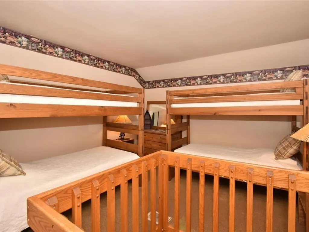The main level includes a fully functional kitchen, a dining table that seats eight, a small room with a day bed, and a powder room. Upstairs, the master bedroom has a king bed, while the second and third bedrooms each have a queen bed, along with two full baths. The loft area features two sets of bunk beds and an additional powder room.