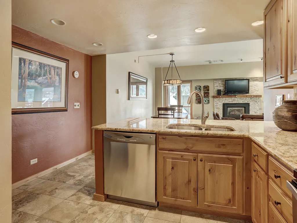 This two bedroom condo has a beautifully decorated living area with a wooden dining table, complemented by attractive and dark furniture and a stone hearth. Enjoy the mounted flat screen TV, visible from almost anywhere in the room including the kitchen. The kitchen features matching stainless steel appliances and newly updated cedar cabinets. The master bedroom comfortably holds a King size bed and 32” flat screen TV, complete with a separate bathroom. The second bedroom features two Queen beds with contemporary bed-frames and a private balcony.